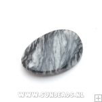 Kleur: grijs/zwart gemeleerd Materiaal: black line stone Afmeting: 28x20mm Inhoud verpakking: 5 kralen